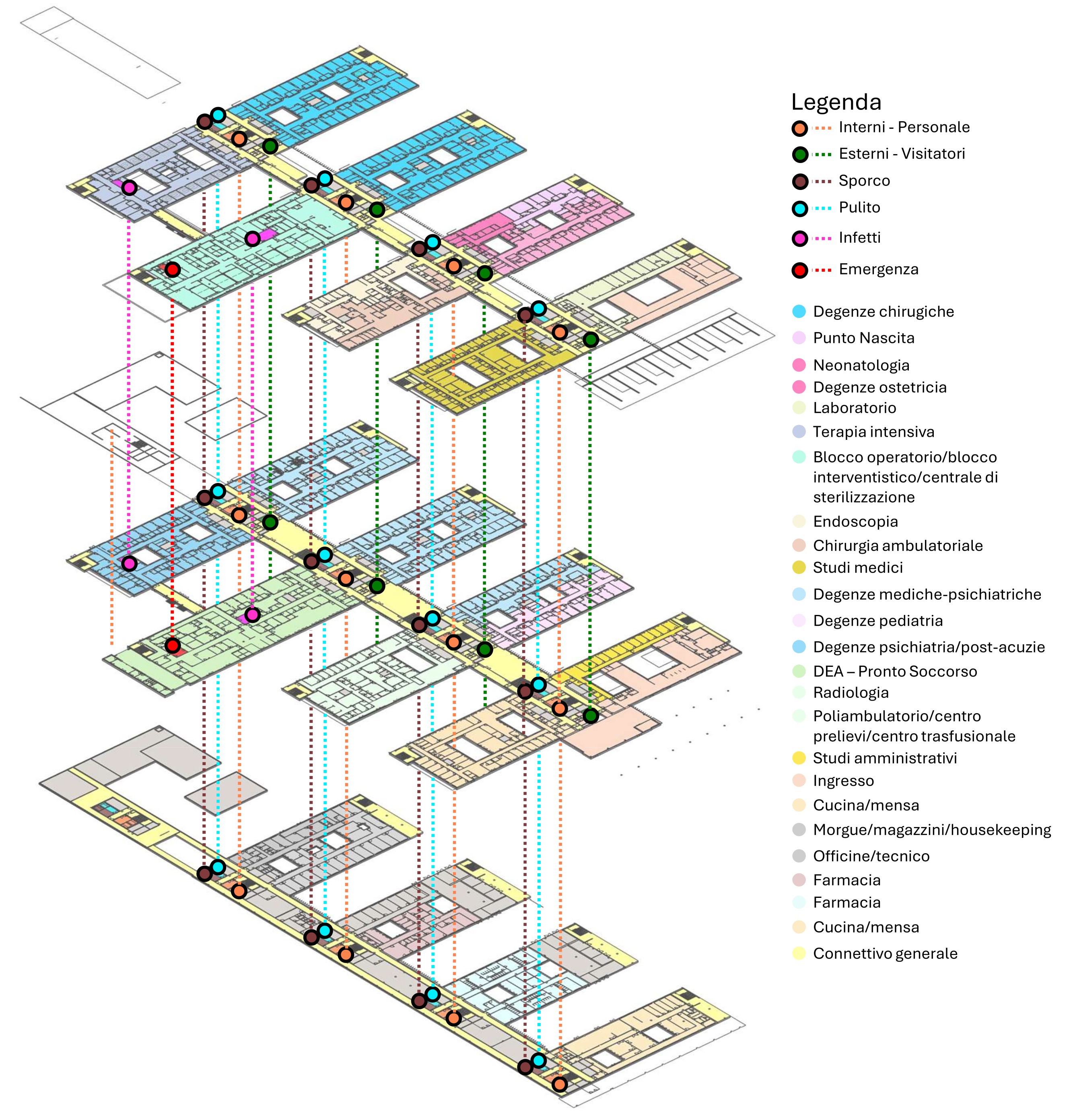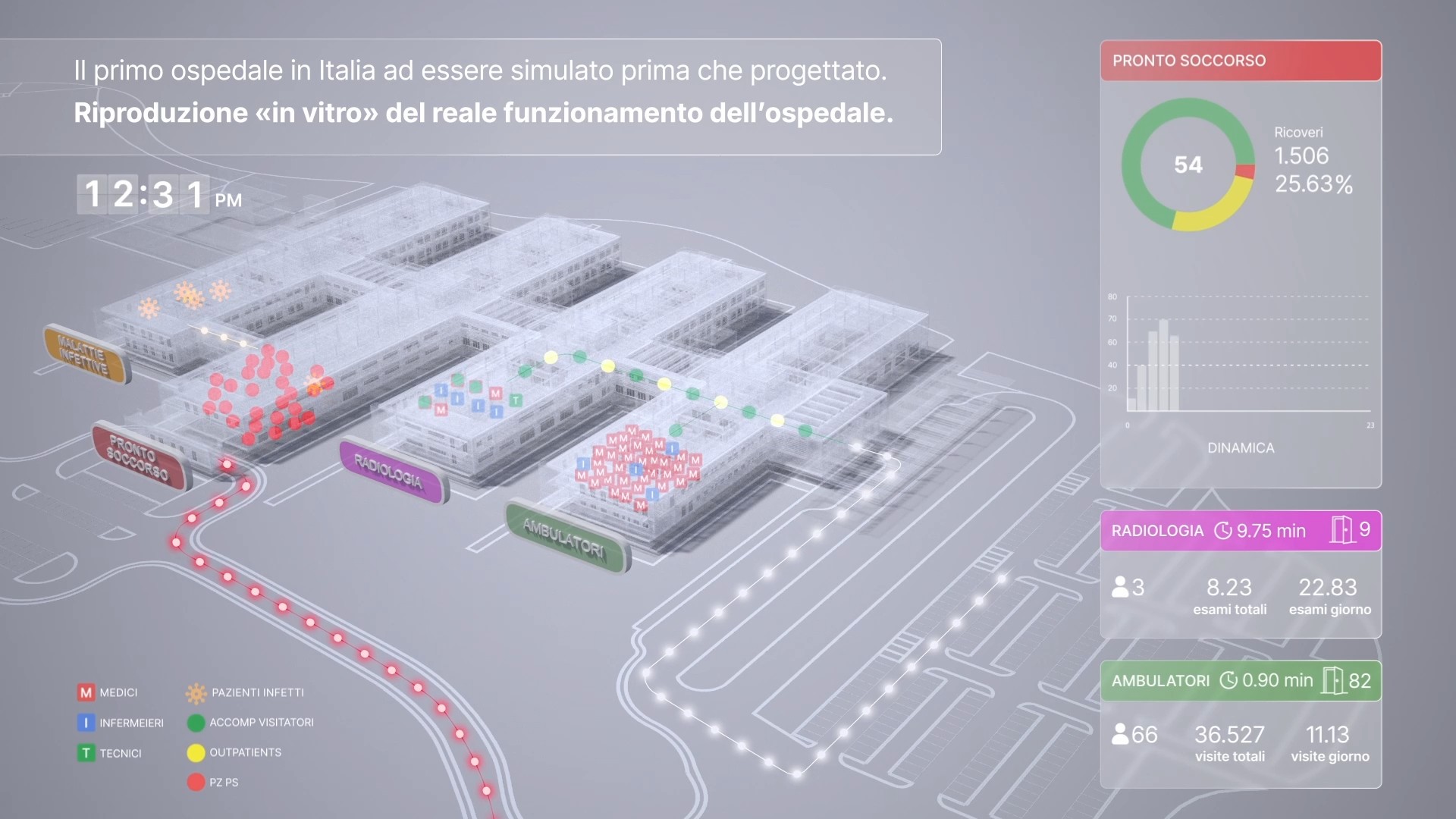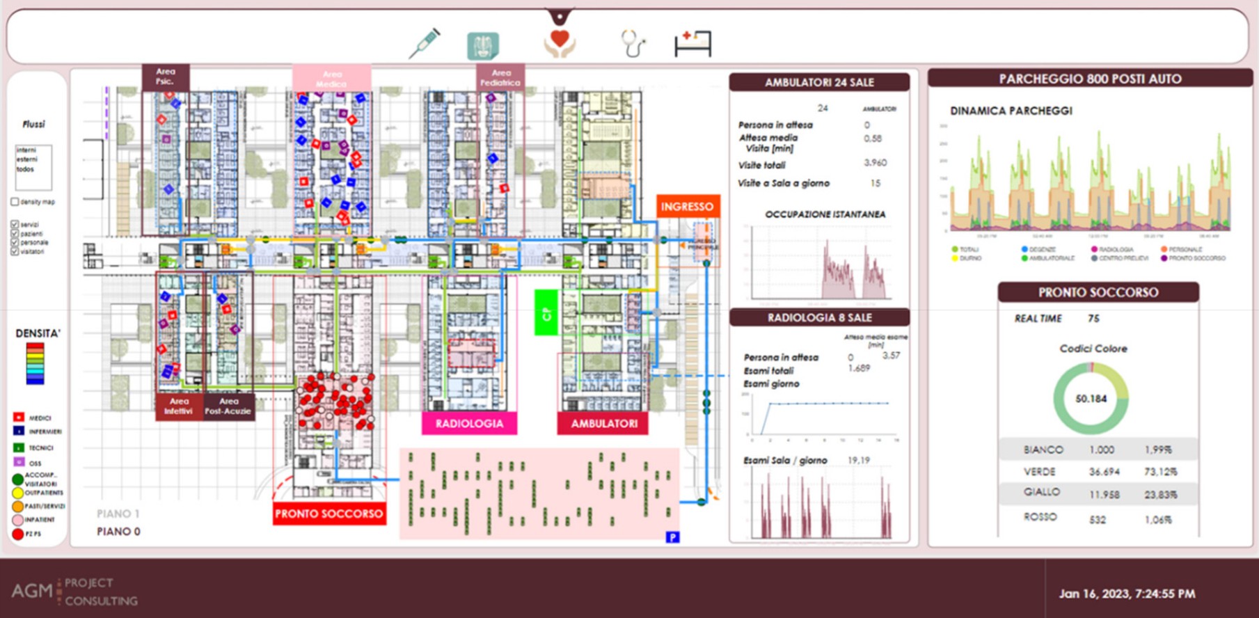 È il primo ospedale italiano interamente simulato prima della progettazione, grazie ai sistemi avanzati di simulazione dinamica sviluppati da AGM, che hanno permesso l’ottimizzazione di flussi, percorsi e organizzazione degli spazi, garantendo elevata qualità architettonica, efficienza, sicurezza e comfort di pazienti ed operatori. La struttura, progettata a partire dai capisaldi di flessibilità (strutturale e impiantistica) ed espandibilità (previsione di espansione futura), serve un bacino di utenza di circa 250.000 cittadini e dispone di 243 posti letto; si prevedono oltre 13.000 ricoveri l’anno e più di 6.000 interventi chirurgici, con un Pronto Soccorso dimensionato per oltre 55.000 accessi annui. Il presidio rappresenta inoltre un nuovo centro di riferimento per le Malattie Infettive, con 24 posti letto dedicati, una netta suddivisione dei percorsi e il massimo grado di operatività nella gestione si situazioni emergenziali e/o nuove esigenze legate all’attività sanitaria.